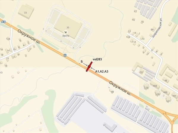 Окружное шоссе, въезд к гипермаркету "Лента", у р.Шограш (р.Содема), справа при движении к Ленинградской ул.